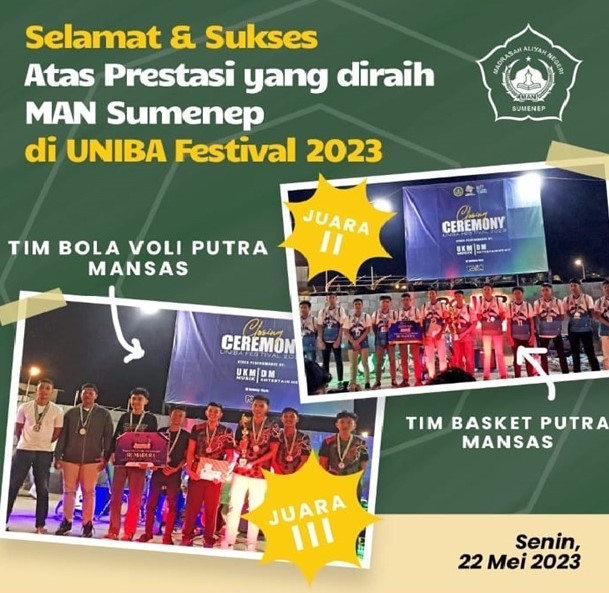 MAN Sumenep – Madaniyah – Pada akhir Semester Genap Tahun Pelajaran 2022-2023, Madrasah Aliyah Negeri Sumenep mengukir prestasi brace gelar dalam ajang Uniba Festival 2023. Pencapaian prestasi level regional Madura dari dua tim cabang olahraga Basket Putra sebagai Juara 2 dan Bola Voli Putra meraih Juara 3. Kompetisi yang diadakan mulai Tanggal 05-13 Mei 2023 di UNIBA Madura.