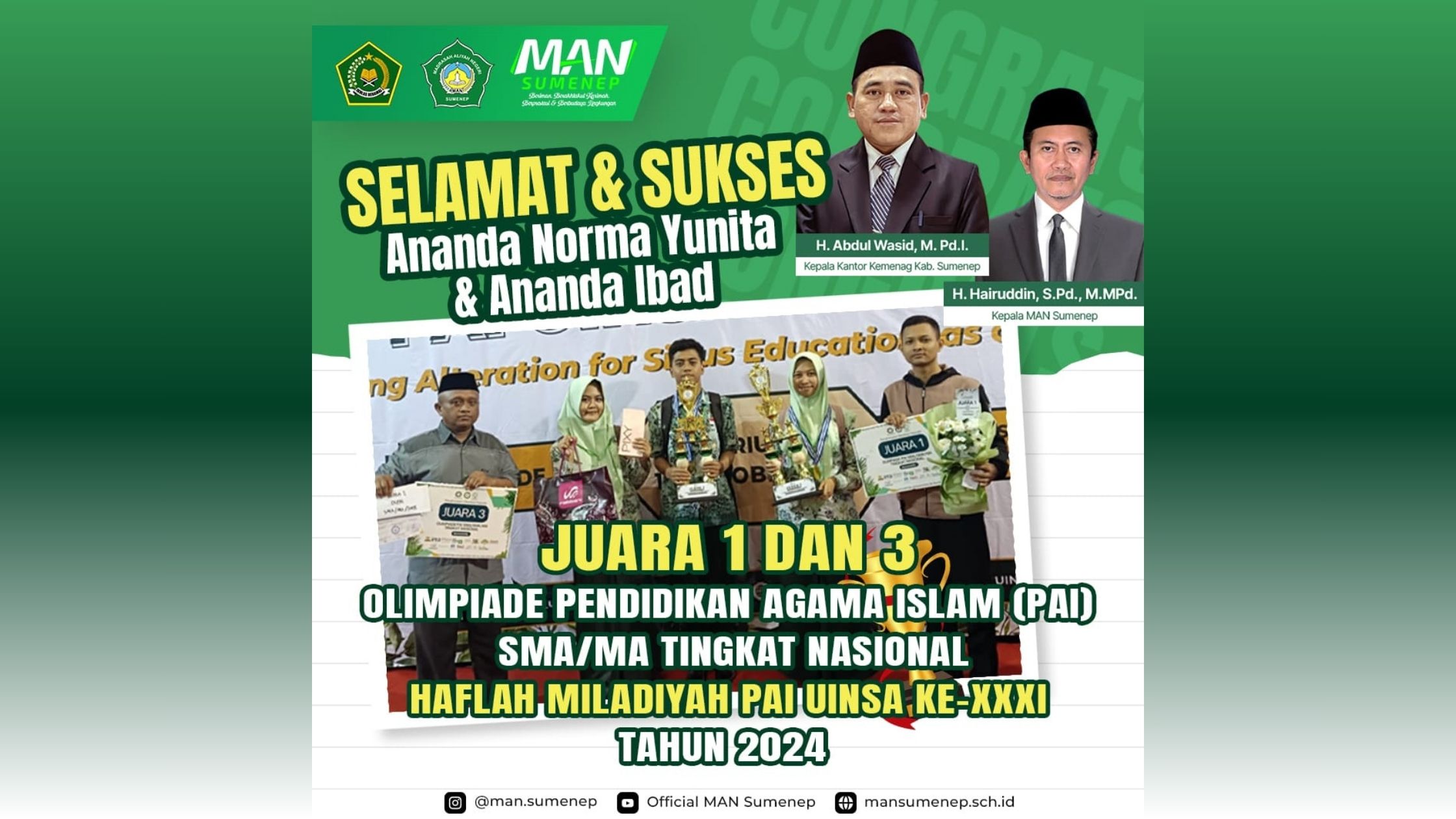 MAN Sumenep – Jurnalistik – MAN Sumenep tampil gacor! dalam ajang Olimpiade Pendidikan Agama Islam (PAI) Tingkat Nasional. Diselenggarakan oleh Himpunan Mahasiswa Prodi Pendidikan Agama Islam Haflah Miladiyah PAI UINSA XXXI mengangkat tema Great Explorious, For a Future Glorious, bertempat di Auditorium Universitas Islam Negeri Sunan Ampel Surabaya (16/10/2024). Madrasah satu-satunya di ujung Timur Pulau Madura ini sukses membawa pulang dua gelar bergengsi sekaligus: Juara 1 dan Juara 3! Kemenangan ini langsung disambut meriah oleh seluruh warga madrasah dan bahkan menarik perhatian masyarakat luas. Pecahkan rekor selama sejarah penyelenggaraan satu lembaga memborong dua gelar juara sekaligus. MAN Sumenep Juara, Bikin Lawan Ketar-Ketir!. Gelar Juara 1 berhasil diraih oleh Norma Yunita, siswi kelas XII-J, yang tampil memukau dalam Final metode cerdas cermat. Dengan pengetahuan agama yang kuat, kecepatan berpikir, dan ketenangan yang luar biasa, Norma sukses menjawab berbagai pertanyaan sulit dengan tepat. “Ini benar-benar pengalaman luar biasa. Saya bangga bisa membawa nama MAN Sumenep menjadi yang terbaik di tingkat nasional,” ujarnya dengan penuh semangat. Tidak berhenti di situ, ananda Ibad siswa kelas X-A juga tak mau kalah. Ibad sukses menyabet gelar Juara 3 setelah mampu menjawab pertanyaan dewan juri dengan penuh percaya diri dan ketenangan menjawab pertanyaan. Kepala Madrasah Aliyah Negeri Sumenep, H. Hairuddin, S.Pd., M.M.Pd., tidak bisa menyembunyikan rasa bangganya. “Ini adalah pencapaian luar biasa! Saya yakin ini tidak lepas dari usaha keras para siswa, dukungan guru pembimbing, dan semangat seluruh warga madrasah.” Kata beliau dengan senyum lebar.