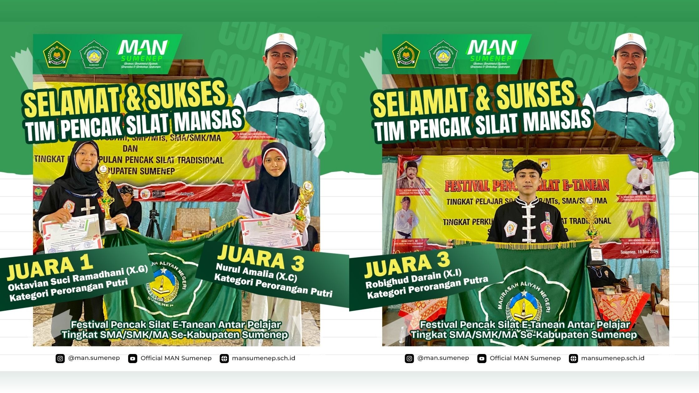 MAN Sumenep – Madaniyah – Prestasi gemilang kembali diukir oleh siswa siswi Madrasah Aliyah Negeri Sumenep. KORMI Komite Olahraga Masyarakat Indonesia (KORMI) dan PSN Perguruan Silat Nasional (PSN) Perisai Putih Sumenep, menyelenggarakan ajang Festival Pencak Silat antar pelajar SMA/SMK/MA tingkat Kabupaten Sumenep, yang digelar di Café Tanean (18/05/2024). Tiga peserta didik MAN Sumenep berhasil mencetak hattrick juara melalui Oktavian Suci Ramadhani (X-G) juara 1 Kategori Perorangan Putri, Nurul Amalia (X-C) juara 3 Kategori Perorangan Putri, dan Robighud Darain (X-I) Kategori Perorangan Putra. Kepala Madrasah Aliyah Negeri Sumenep H. Hairuddin, S.Pd, M.M.Pd. mengungkapkan rasa bangganya atas pencapaian ini, “Hattrick juara ini adalah hasil dari latihan yang intensif dan semangat pantang menyerah. Kami sangat bangga dan berharap prestasi ini dapat menginspirasi siswa-siswi lainnya,” ujar beliau.penuh rasa syukur. Keberhasilan ini tidak hanya menjadi kebanggaan bagi sang juara, tetapi juga membawa dampak positif bagi MAN Sumenep. Pelatih Pencak Silat, Nadia Utami Ramadhanty S.Pd, menyampaikan rasa bangga dan apresiasinya terhadap para siswa yang telah berjuang keras hingga mencapai prestasi gemilang ini. “Keberhasilan Oktavian, Nurul, dan Robighud adalah hasil dari latihan intensif, semangat juang, dan dukungan dari seluruh keluarga besar MAN Sumenep. Kami sangat bangga dan syukur Alhamdulillah,” ujar Kak Nadia. Madrasah akan selalu mendukung penuh setiap siswa yang ingin mengembangkan bakatnya, baik di bidang akademik maupun non-akademik. Dengan pencapaian ini, MAN Sumenep semakin memperkuat posisinya sebagai salah satu madrasah unggulan di bidang olahraga pencak silat.