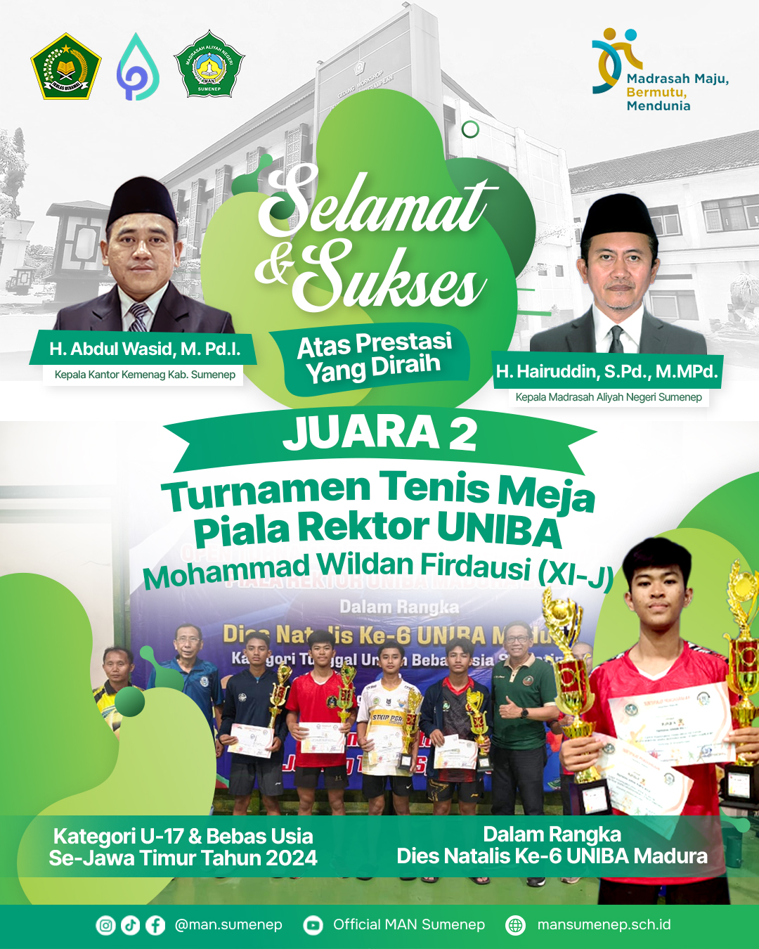MAN Sumenep – Jurnalistik – Mohammad Wildan Firdausi (XI-J), siswa MAN Sumenep sukses merebut posisi juara 2 di Turnamen Tenis Meja Kategori U-17 se-Jawa Timur, yang diselenggrakan oleh Persatuan Tenis Meja Seluruh Indonesia (PTMSI) Kabupaten Sumenep. Memperebutkan Piala Rektor Uniba Madura, berlangsung di GOR H. Achmad Dahlan, Minggu (8/12/2024) dengan mempertandingkan 2 kategori yakni tunggal umum bebas usia dan tunggal umum 17 tahun. Kegiatan yang berlangsung dalam rangka Dies Natalis Uniba Madura Ke 6 ini diikuti sekitar 80 peserta dari berbagai daerah di Jawa Timur. Wildan menunjukkan performa gemilang sepanjang turnamen, mengalahkan lawan-lawan tangguh dari berbagai daerah. Prestasi ini menjadi bukti bahwa siswa madrasah tidak hanya unggul di bidang akademik, tetapi juga memiliki potensi besar di bidang olahraga. Kepala MAN Sumenep, H. Hairuddin, S.Pd., M.M.Pd., menyatakan rasa syukurnya atas pencapaian Wildan. “Semoga ini menjadi motivasi bagi siswa lainnya untuk terus berprestasi dan mengharumkan nama madrasah serta daerah,” ujar beliau memotivasi. Turnamen yang diikuti oleh puluhan peserta dari seluruh Jawa Timur ini menjadi ajang pembuktian bahwa kerja keras dan tekad dapat membawa hasil yang membanggakan. Dengan pencapaian ini, Wildan telah mengukir sejarah baru bagi MAN Sumenep dan membuka jalan untuk prestasi lebih besar di masa depan. Selamat kepada Wildan atas prestasinya! Semoga semakin sukses di turnamen-turnamen berikutnya.