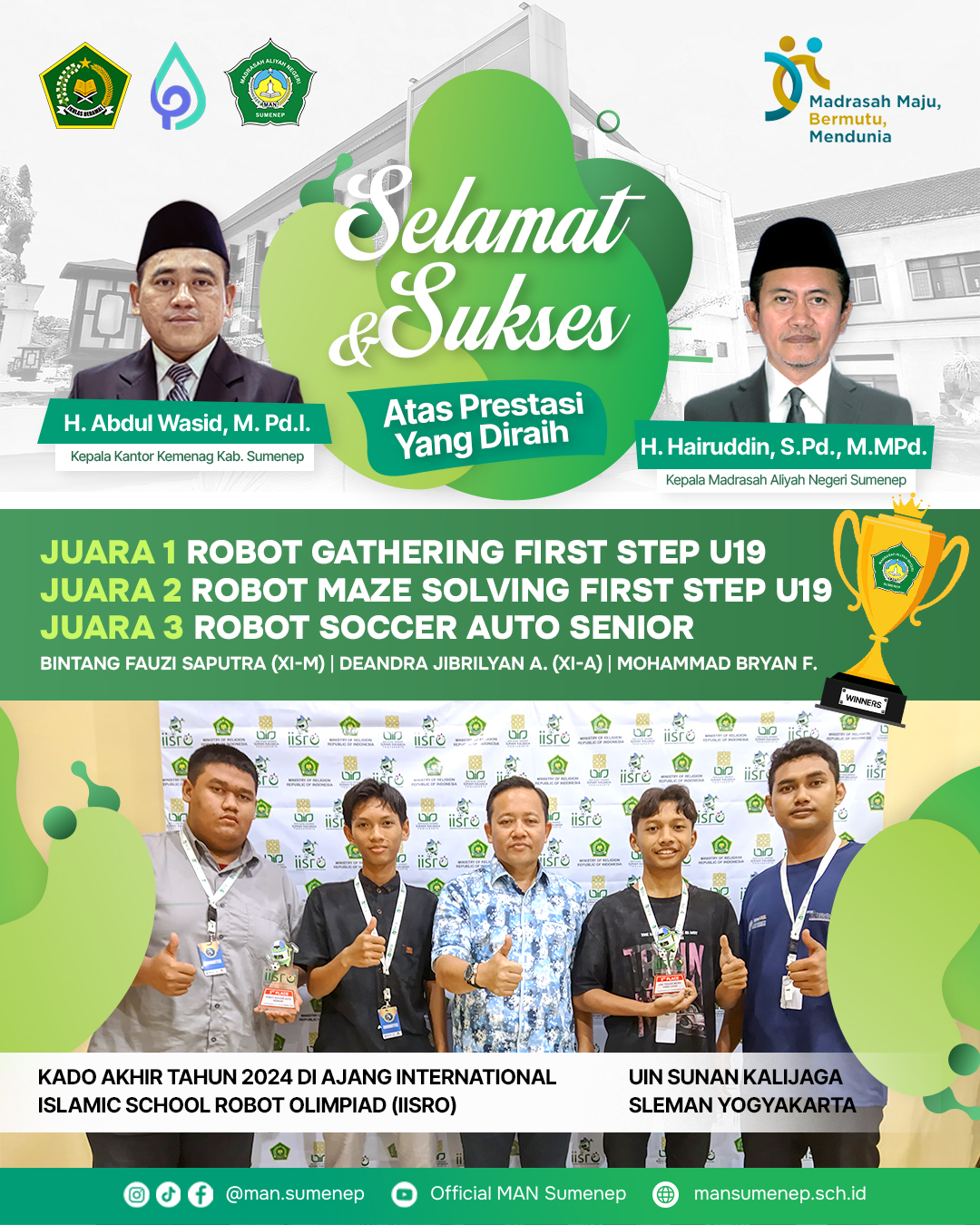 MAN Sumenep – Jurnalistik – Prestasi mendunia berhasil diukir oleh Tim Robotik MAN Sumenep, yang berhasil mencetak hattrick gelar juara di ajang bergengsi International Islamic School Robot Olimpiad (IISRO) 2024 yang digelar di UIN Sunan Kalijaga Sleman Yogyakarta (23/12/2024). Ajang ini diikuti oleh puluhan tim dari berbagai negara, menjadikan kemenangan ini sebagai pencapaian yang membanggakan bagi Sumenep, Jawa Timur, bahkan Indonesia. Tim Robotik MAN Sumenep sukses memborong tiga gelar juara sekaligus. Juara 1 Robot Gathering First Step U-19, Prioritas misi mengemudikan robot secara cepat dan akurat. Juara 2 Robot Maze Solving First Step U-19, Misi prioritas menyelesaikan labirin bola bergulir secara cepat untuk diselesaikan dengan mengambil semua poin berturut-turut dan tidak menjatuhkan kelereng ke dalam kereta, dan Juara 3 Robot Soccer Auto Senior, Misi dari kompetisi Robot Soccer Auto Senior adalah untuk menciptakan robot otonom yang dapat bermain sepak bola dengan kemampuan navigasi, strategi, dan koordinasi yang baik. Tim ini dimotori oleh Bintang Fauzi Saputra (XI-M), Deandra Jibrilyan. A (XI-A), Mohammad Brian. F (XI-L). Ide brilian mereka tidak hanya mencuri perhatian juri tetapi juga mendapat apresiasi dari peserta lain. “Alhamdulillah, setelah perjuangan panjang akhirnya bisa memberi yang terbaik untuk MAN Sumenep. Kami sangat bersyukur atas pencapaian ini. Perjuangan dan kerja keras tim akhirnya membuahkan hasil yang membanggakan,” ujar pembimbing tim, Bapak Ryo Chandra Aldi Wibawa, ST., dalam sesi wawancara. Beliau menekankan bahwa kemenangan ini merupakan hasil kolaborasi antara siswa, guru, dan dukungan penuh dari madrasah. Kepala MAN Sumenep, H. Hairuddin, S.Pd., M.M.Pd., menuturkan “Alhamdulillah, prestasi ini adalah sebuah kebanggaan luar biasa bagi madrasah, karena mampu meraih juara di tingkat internasional, MAN Sumenep akan terus mencetak generasi muda yang akan membawa Indonesia menuju masa depan yang lebih cerah.” Tutur beliau memotivasi. Dengan kemenangan ini, MAN Sumenep membuktikan bahwa generasi muda Indonesia mampu bersaing di panggung internasional, dan terus berkomitmen untuk terus mendukung inovasi siswa dalam menjawab tantangan global di masa depan. Selamat kepada tim robotik MAN Sumenep, teruslah menginspirasi!