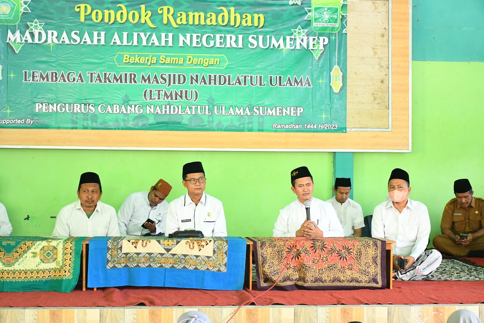 MAN Sumenep – Madaniyah – Pondok Ramadan 1444 H yang diselenggarakan Madrasah Aliyah Negeri Sumenep bekerja sama dengan Lembaga Takmir Masjid Nahdlatul Ulama (LTMNU) badan otonom Pengurus Cabang Nahdlatul Ulama Sumenep. Menghadirkan keceriaan dan khidmat rangkaian acara Pondok Ramadan 1444 H (27-29/03/2023). Peserta Pondok Ramadan 1444 H merupakan seluruh peserta didik kelas XII dimulai hari Senin sampai Rabu. Sedangkan kelas X dan XI akan diadakan setelah kelas XII melaksanakan Assesment Madrasah. Bertempat di aula yang menjadi satu dengan halaman masjid Ar-Rasyidi. Dalam sambutannya Kyai Zubairi Karim Wakil Ketua PCNU Sumenep menuturkan, “Kegiatan ini tidak hanya sebagai pintu gerbang Bulan Ramadan, melainkan juga di luar itu LTM NU hadir memfasilitasi pelatihan salat sempurna dan pemulasaran jenazah, agar nanti anak didik di MAN Sumenep memiliki kemampuan yang berguna di masyarakat.” Ujarnya. Menyerap ilmu pelatihan salat sempurna dan pemulasaran jenazah sangatlah penting, karena nantinya akan diterapkan ketika ada keluarga, sanak saudara atau tetangga tempat dimana kita berinteraksi di masyarakat.