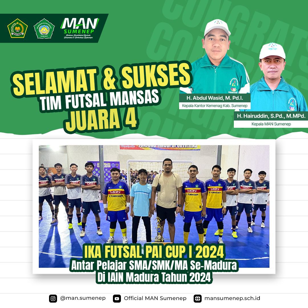 Sumenep – Tim futsal Madrasah Aliyah Negeri (MAN) Sumenep berhasil mengukir prestasi dengan meraih juara 4 dalam ajang IKA Futsal PAI Cup 2024, yang diselenggarakan oleh IAIN Madura pada 5-9 Novemver 2024. Kompetisi futsal antar SMA/SMK/MA/sederajat se-Madura ini bertujuan untuk membina bibit muda atlit futsal Madura. Meski menghadapi lawan-lawan tangguh dari berbagai tim sekolah jenjang menengah atas di Pulau Madura, tim futsal MAN Sumenep menunjukkan permainan yang impresif dan penuh semangat di setiap pertandingan. Selama pertandingan, tim futsal MAN Sumenep mampu memperlihatkan strategi yang matang dan kekompakan tim, sehingga sukses melaju hingga babak semifinal. Kepala MAN Sumenep, H. Hairuddin, S.Pd., M.M.Pd., mengapresiasi perjuangan tim futsal yang telah memberikan yang terbaik. “Kami bangga atas prestasi yang diraih. Meskipun belum menjadi juara utama, mereka sudah menunjukkan kemampuan dan kerja keras yang luar biasa. Semoga ini menjadi motivasi untuk mencapai hasil yang lebih baik di kompetisi mendatang,” ujar beliau memotivasi. Prestasi ini diharapkan bisa menjadi inspirasi bagi siswa-siswi lainnya di MAN Sumenep untuk terus berkompetisi dan mengembangkan potensi di berbagai bidang. Dengan semangat dan dedikasi yang tinggi, tim futsal MAN Sumenep optimis bisa meraih prestasi yang lebih gemilang di masa depan.