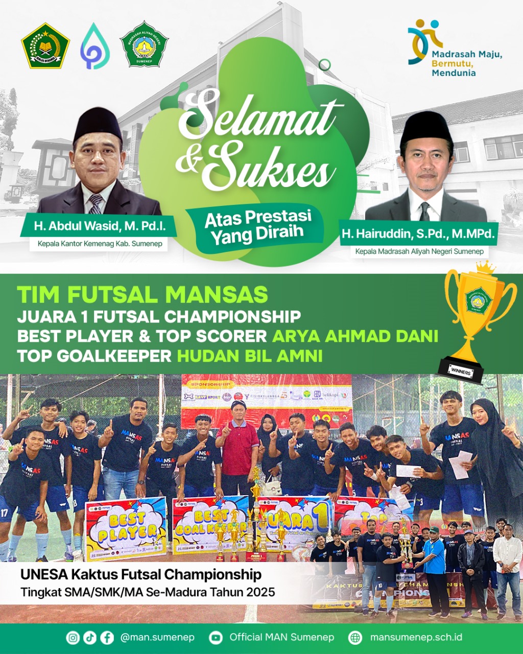 MAN Sumenep – Jurnalistik – Tim MAN sumenep menunjukkan kebolehan luar biasa di dunia olahraga, kali ini dengan menorehkan prestasi gemilang di ajang Kaktus Futsal Championship 2025, dengan berhasil meraih gelar juara pertama setelah melewati serangkaian pertandingan sengit yang memukau para penonton. Turnamen yang digelar di Lapangan Tirta Sumekar Indah (TSI) pada 21 Januari hingga 1 Februari 2025.